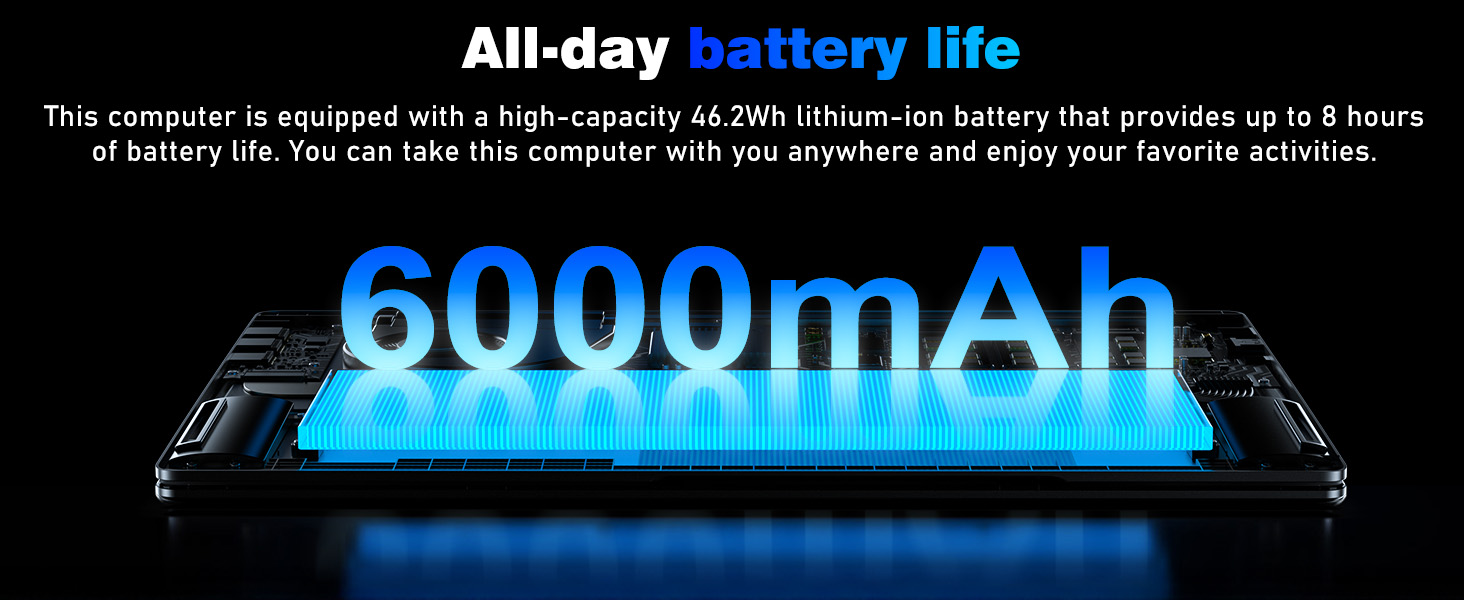 - Long-lasting battery life: Our laptop is equipped with a 7.7V rechargeable lithium-ion polymer battery with a capacity of 6000mAh/46.2Wh, providing up to 4 hours of battery life at maximum brightness, meeting your basic needs for all-day office work.